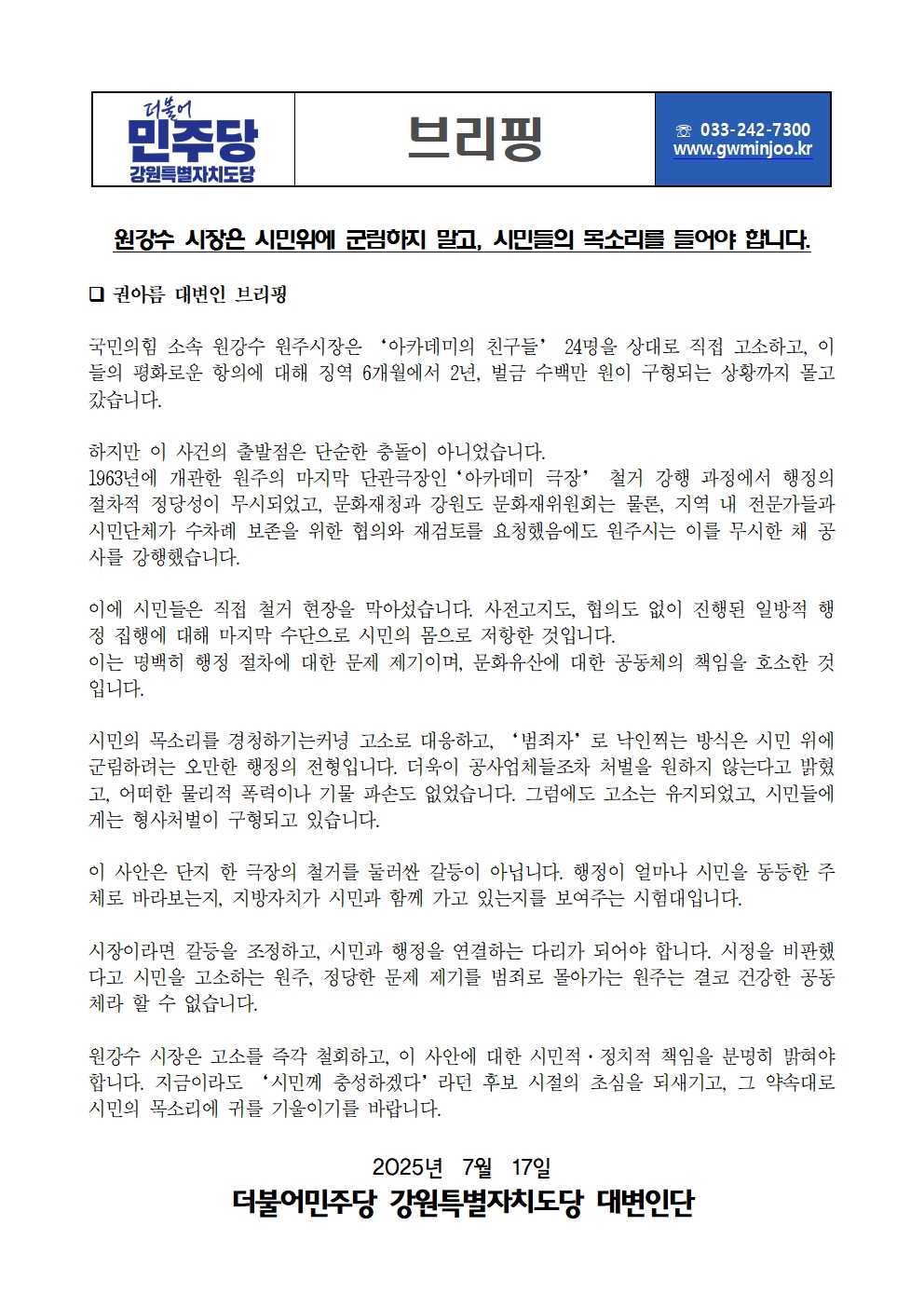 목, 2025/07/17- 00:00 에 admin 에 의해 제출됨 [0] 관련 개인/그룹 민주당 강원도당 정당 더불어민주당 지역 강원 카테고리 보도자료·성명·논평 링크 https://www.gwminjoo.kr/portal/F20000/F20300/boardView?board_key=3385&page=1 Like 0 Dislike 0 1 view 댓글 달기 이름 제목 Comment 저장 Preview