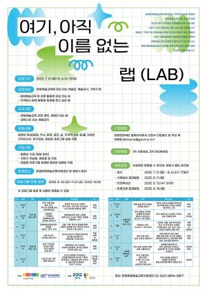 광명문화재단(대표이사 송은영)은 지역중심 문화예술교육 지원사업의 일환으로 추진되는‘여기, 아직 이름 없는 랩(LAB)’의 참여자를 7월 21일(월) 부터 8월 6일(수)까지 모집한다. 모집 인원은 총 12명 내외이며, 문화예술교육에 관심 있는 예술인, 예술강사, 기획자 누구나 지원 가능하다.본 사업은 3년 연속 경기문화재단의 지원을 받는 공모형 프로젝트로, 기초 생활권 단위의 문화예술교육 기반 조성과, 지역 맞춤형 교육 모델 발굴을 목표로 한다.‘여기, 아직 이름 없는 랩(LAB)’은 8월 22일(금)부터 11월 21일(금)까지 매