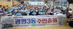 광명시 광명3동 주민자치회(회장 민병돈)는 지난 18일 광명3동 행정복지센터에서 ‘2025년 제5회 주민총회’를 성황리에 개최했다.이번 주민총회에는 박승원 광명시장을 대신해 황희민 자치행정국장이 참석했으며, 임오경 국회의원, 시·도의원, 그리고 광명3동 주민 200여 명이 함께했다.총회는 ▲지역 현안인 목감천 관리방안 토론회 ▲2025년 주민자치회 활동 및 추진사항 보고 ▲2024년 주민자치회 감사 보고 ▲2026년 주민자치회 자치계획 발표 및 투표 순으로 진행됐다.주민자치회에서는 2026년 마을사업으로 ‘무지개 골목길 정원 정비