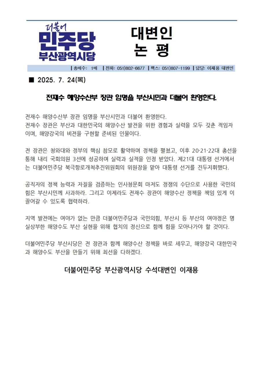목, 2025/07/24- 00:00 에 admin 에 의해 제출됨 [0] 관련 개인/그룹 민주당 부산시당 정당 더불어민주당 지역 부산 카테고리 논평브리핑 링크 https://busan.theminjoo.kr/party/sub/news/view.php?brd=65&post=3713&board_id=briefing Like 0 Dislike 0 댓글 달기 이름 제목 Comment 저장 Preview