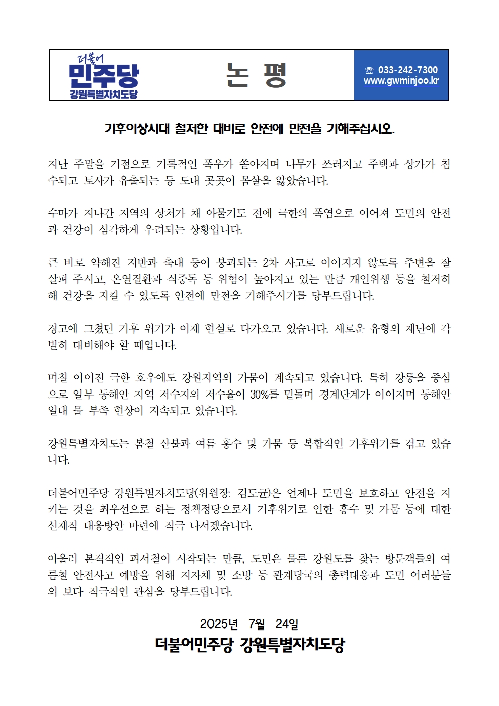 목, 2025/07/24- 00:00 에 admin 에 의해 제출됨 [0] 관련 개인/그룹 민주당 강원도당 정당 더불어민주당 지역 강원 카테고리 보도자료·성명·논평 링크 https://www.gwminjoo.kr/portal/F20000/F20300/boardView?board_key=3391&page=1 Like 0 Dislike 0 댓글 달기 이름 제목 Comment 저장 Preview