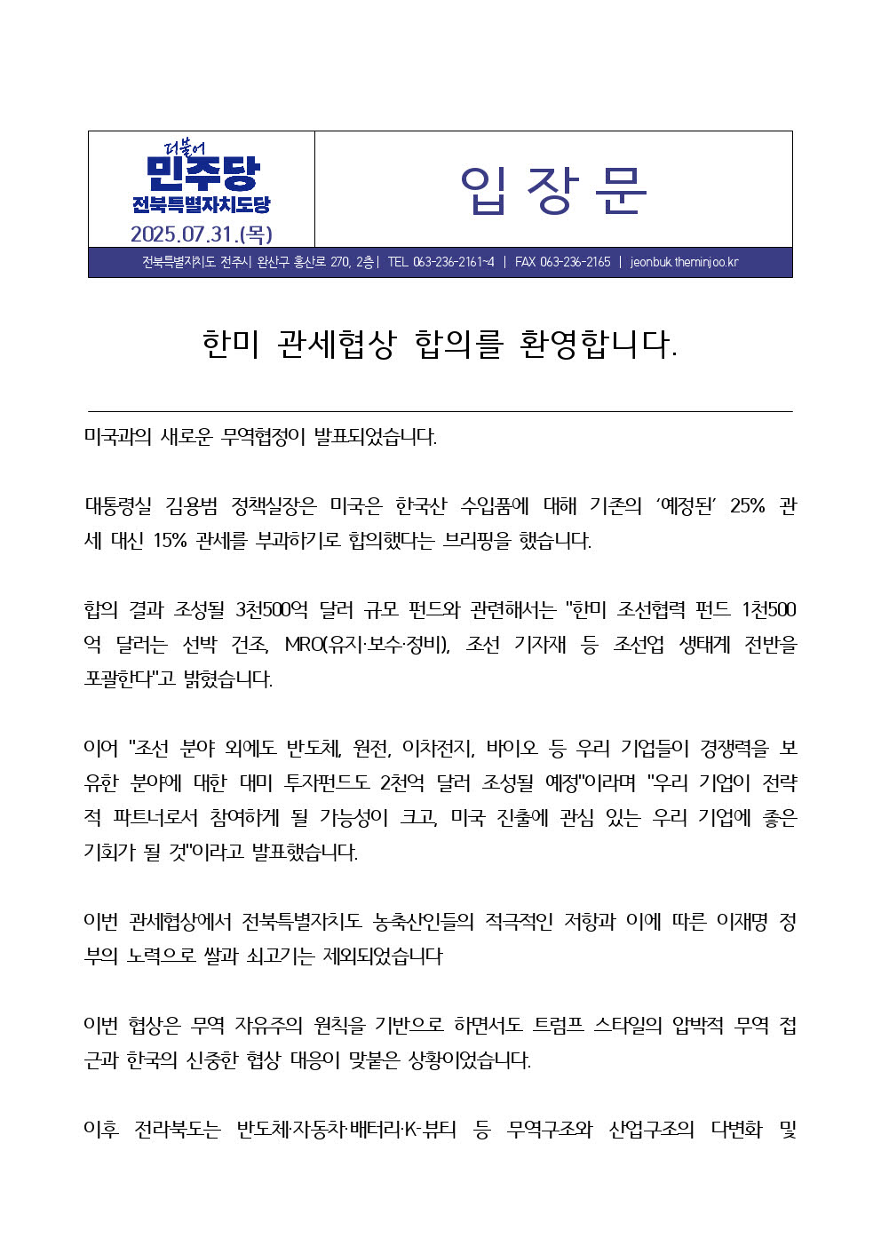 목, 2025/07/31- 00:00 에 admin 에 의해 제출됨 [0] 관련 개인/그룹 민주당 전북도당 정당 더불어민주당 지역 전북 카테고리 보도자료·성명·논평 25.07.31_[입장문]_한미_관세협상_합의_환영_v1.0.hwp최창호 부대변인.jpg 링크 https://jeonbuk.theminjoo.kr/party/sub/news/view.php?brd=60&post=1874&board_id=briefing Like 0 Dislike 0 1 view 댓글 달기 이름 제목 Comment 저장 Preview