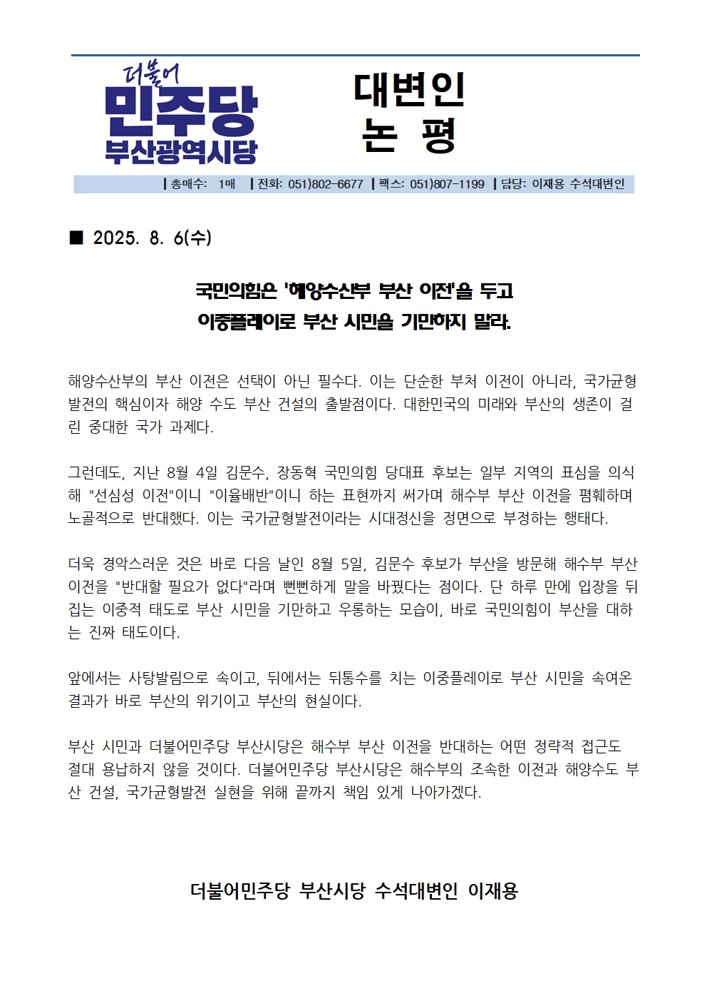 목, 2025/08/07- 00:00 에 admin 에 의해 제출됨 [0] 관련 개인/그룹 민주당 부산시당 정당 더불어민주당 지역 부산 카테고리 논평브리핑 링크 https://busan.theminjoo.kr/party/sub/news/view.php?brd=65&post=3719&board_id=briefing Like 0 Dislike 0 댓글 달기 이름 제목 Comment 저장 Preview