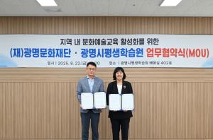 광명문화재단(대표이사 송은영)은 22일 광명시평생학습원(원장 정찬수)과 지역 내 문화예술교육 활성화를 위한 업무협약(MOU)을 체결했다고 밝혔다.광명시평생학습원에서 개최된 이번 협약식은 광명문화재단 송은영 대표이사와 광명시평생학습원 정찬수 원장을 포함한 각 기관 관계자들이 참석했다.이번 협약은 두 기관의 협력 체계를 한층 발전시켜 지역 문화시설의 활성화와 사업 운영의 효율성을 제고, 그리고 시민 참여 기회의 확대를 도모하고자 마련되었다.협약의 주요 내용은 ▲문화예술교육 사업 운영을 위한 공간 상호 협력 ▲문화예술교육 기획 및 운영