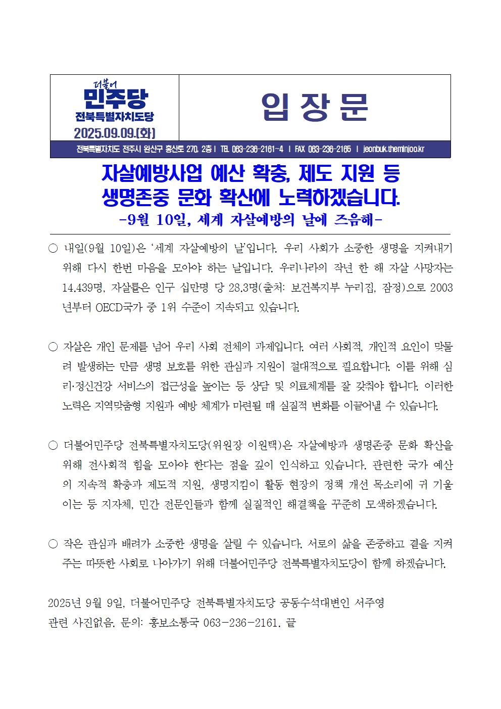 화, 2025/09/09- 00:00 에 admin 에 의해 제출됨 [0] 관련 개인/그룹 민주당 전북도당 정당 더불어민주당 지역 전북 카테고리 보도자료·성명·논평 250909_[입장문]_세계자살예방의날에 즈음해-공동수석대변인서주영.hwp 링크 https://jeonbuk.theminjoo.kr/party/sub/news/view.php?brd=60&post=1888&board_id=briefing Like 0 Dislike 0 댓글 달기 이름 제목 Comment 저장 Preview
