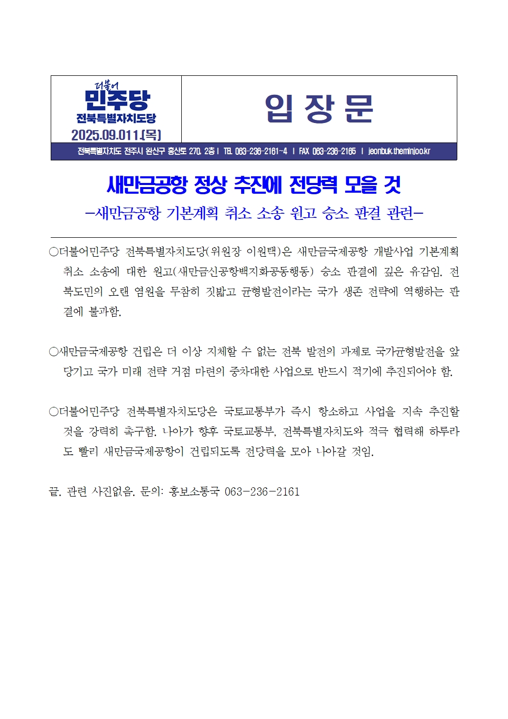 목, 2025/09/11- 00:00 에 admin 에 의해 제출됨 [0] 관련 개인/그룹 민주당 전북도당 정당 더불어민주당 지역 전북 카테고리 보도자료·성명·논평 250911[입장문]새만금공항1심 판결관련.hwp 링크 https://jeonbuk.theminjoo.kr/party/sub/news/view.php?brd=60&post=1890&board_id=briefing Like 0 Dislike 0 댓글 달기 이름 제목 Comment 저장 Preview