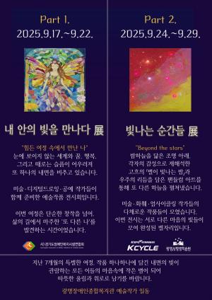 광명장애인종합복지관은 17일부터 29일까지 카페 가우디에서 ‘2025 광명장애예술작가 작품전시회 《빛으로 피어나다》’를 개최한다고 밝혔다.이번 전시는 제1전시 《내 안의 빛을 만나다 展》(9월 17일~22일)과 제2전시 《빛나는 순간들 展》(9월 24일~29일)로 나뉘어 진행된다. 제1전시는 장애인 전문예술가 ‘밝은빛 아카데미’ 작가들의 순수미술, 한지공예, 디지털 드로잉 작품을 선보이며, 제2전시는 창의미술(아트웨이브·지역연계), 광명ECO 작품전시와 함께 화훼아트·스마트팜 체험부스를 운영해 시민들이 예술을 직접 경험할 수 있도록