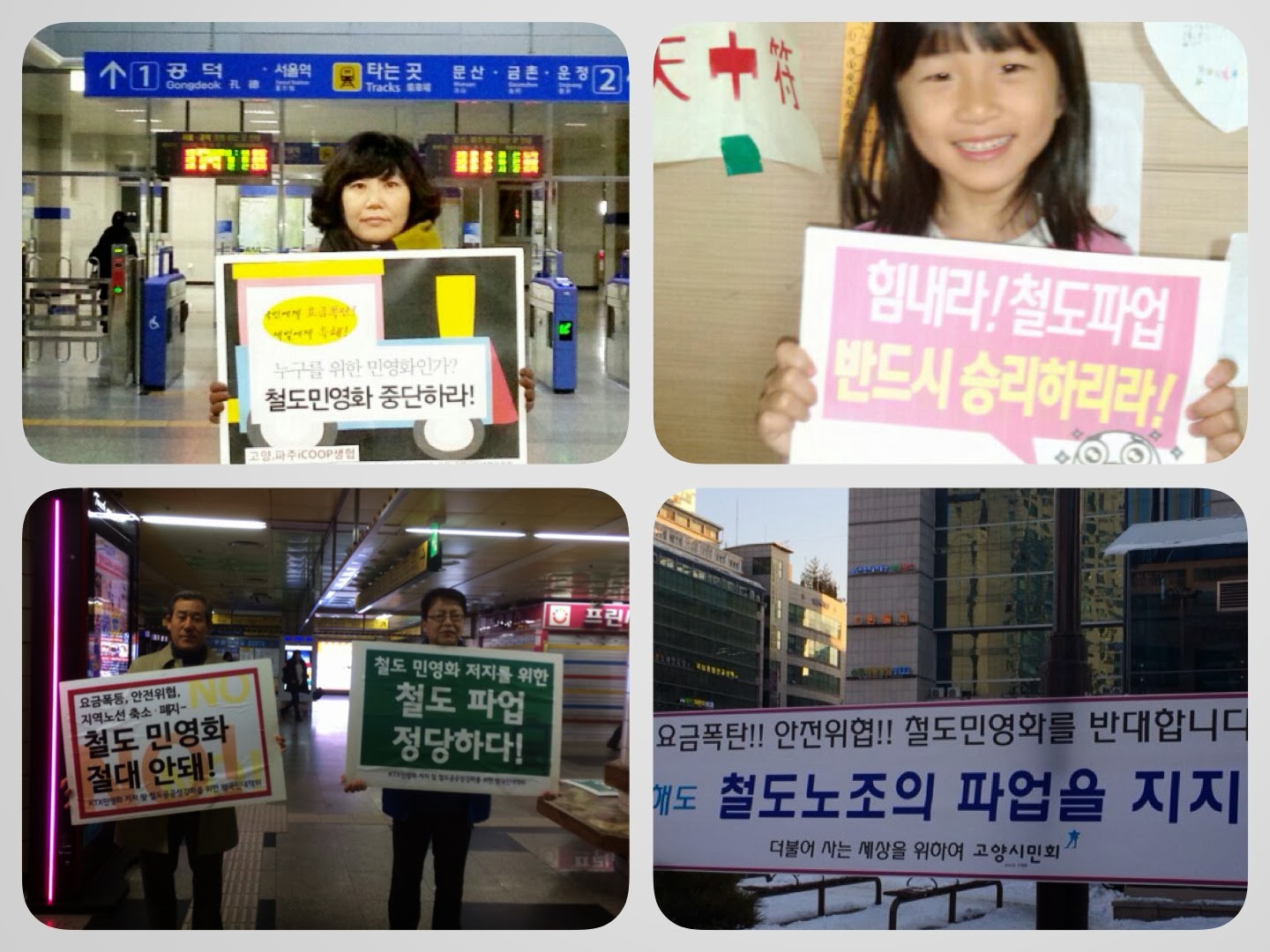 고양시민사회연대회의를 비롯한 철도민영화저지 고양시민대책위에 참여한 단체들은 지난 9일부터 고양시 주요 전철 및 철도역에서 민영화저지 및 철도노조 파업지지 선전전을 진했습니다. 특히 이번 선전전에는 고양아이쿱 생협 등 생활과 밀착한 단체들도 참여해서 정부의 철도민영화추진에 제동을 걸고 있습니다.