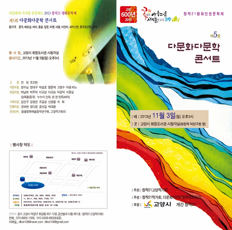 - 11월 3일(일) 오후 3시, 화정도서관 시청각실 제5회 다문화다문학콘서트(창작21작가회 주최)