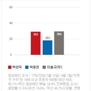 YTN 여론조사 결과, 새누리당 박성덕 후보 29.2%, 더민주 박응천 후보 18.3%, 무소속 이철규 후보 29.6%를 기록했습니다.
