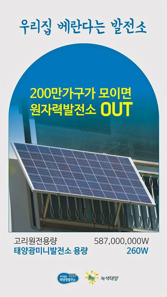 미니태양광 신청받고 있슴니다. 부산시는 250가구 먼저 신청하는 순입니다. 신청할 곳 442-2008.성함 주소 전화번를 남겨주시면 6월 중으로 설치합니다. 가격은 부산시의 지원 50만원 자부담 세금포함 16만 5천원입니다.(이미지는 권대오님의 페이지에서 빌려왔습니다.)