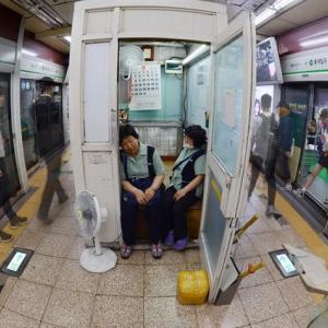 지난달 26일 오후 지하철 2호선 홍대입구역 승강장의 맨 끝 지점, 청소노동자 김모(58)씨와 임모(60)씨가 낡은 철재 부스 안에 걸터앉아 있다. 주변 시설과 어울리지 않게 작고 초라한 부스는 이들에겐 유일한 휴식처, 그러나 승강장에서 발생하는 열기와 한기, 소음과 미세먼지를 막아내기엔 터무니 없이 비좁고 허술하다. 공기정화장치가 없어 문을 항상 열어두다 보니 승객들의 시선과 요란한 안내방송마저 휴식의 일부가 된지 오래다. 승강장으로 진입하고 빠져나가는 전동차의 진동도 그대로 온몸으로 전해진다. 잠시 후 청소도구를 손에 든 황모(61)씨가 전동차에서 내리자마자 부스 앞 간이 의자에 털썩 주저앉았다. 부스가 비좁은 탓에 3~4명이 동시에 휴식을 취할 땐 부스 대신 간이 의자를 이용해야 한다.