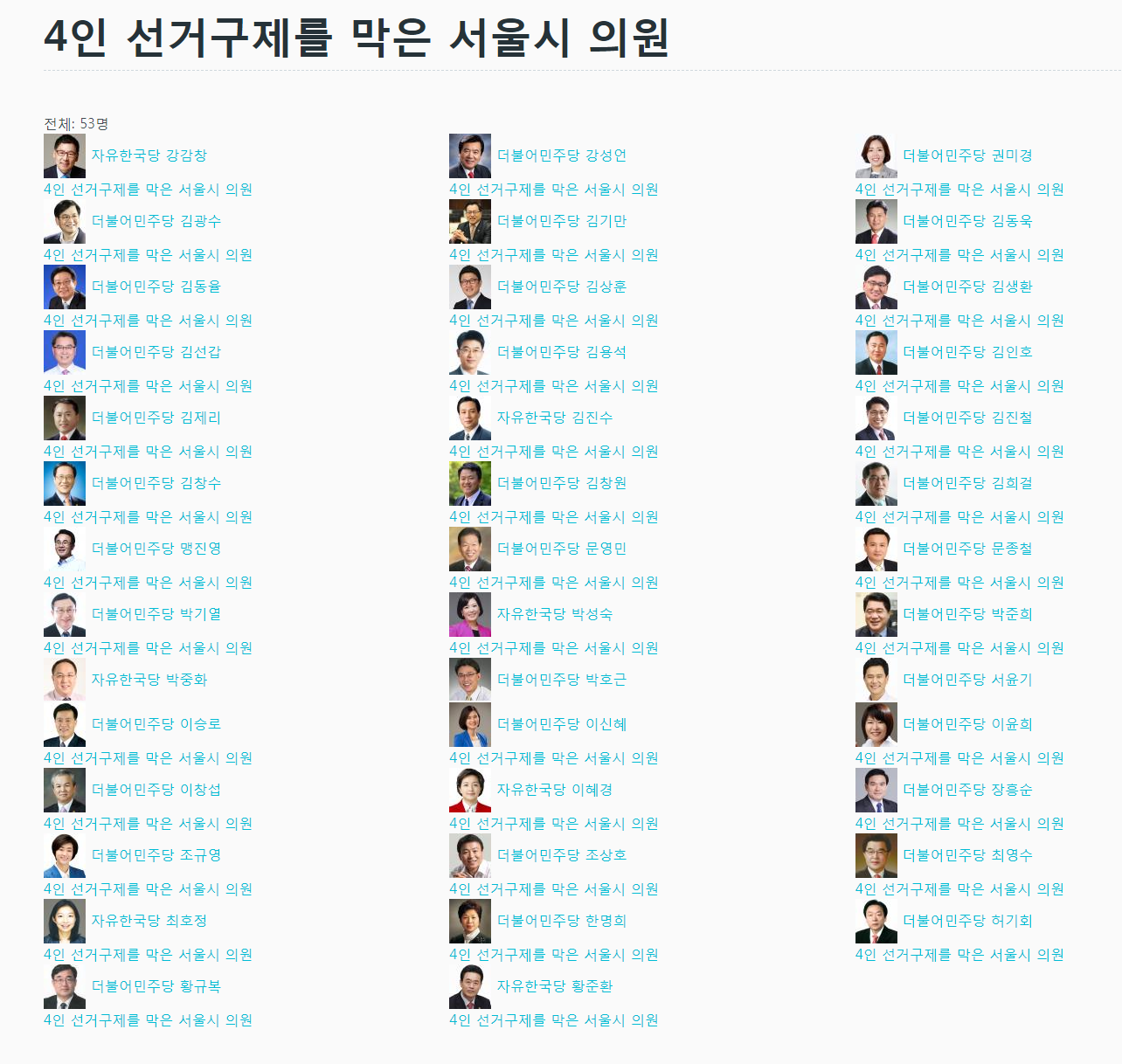 관련 7개의 4인 선거구제 조차 허용하지 않았던 53명의 서울시 명단 입니다.