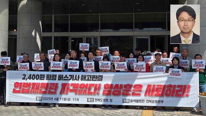 윤석열퇴진 전북운동본부는 오늘(11일) 전북도의회 앞에서 기자회견을 열고 “함 후보자는 2,400원을 횡령했다는 이유로 해고된 버스 노동자의 해고 무효 소송에서 해고가 정당하다는 판결을 내린 반노동 판사였다”고 비판했습니다.
