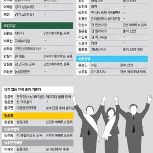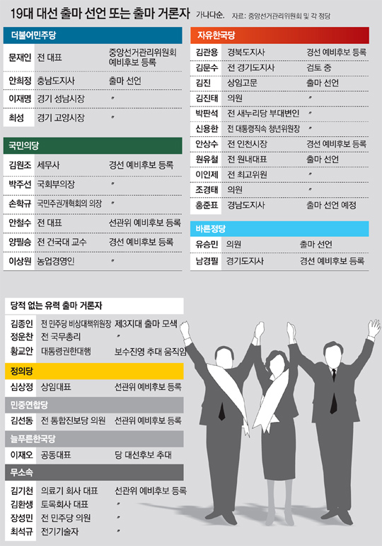 조기 대선이 확정되면서 출마를 선언했거나 자천타천으로 출마 의사를 보이는 주자가 14일 현재 33명에 이르는 것으로 나타났다. 사상 초유의 현직 대통령 탄핵으로 정치적 불확실성이 커지자 대선을 발판으로 정치적 입지를 넓히려는 주자들이 잇달아 출사표를 내고 있는 것이다. 특히 자유한국당에선 11명이 출마를 선언하거나 출마를 저울질하는 가운데 경선 룰을 놓고 불협화음이 커지면서 ‘자중지란’ 양상까지 보이고 있다.