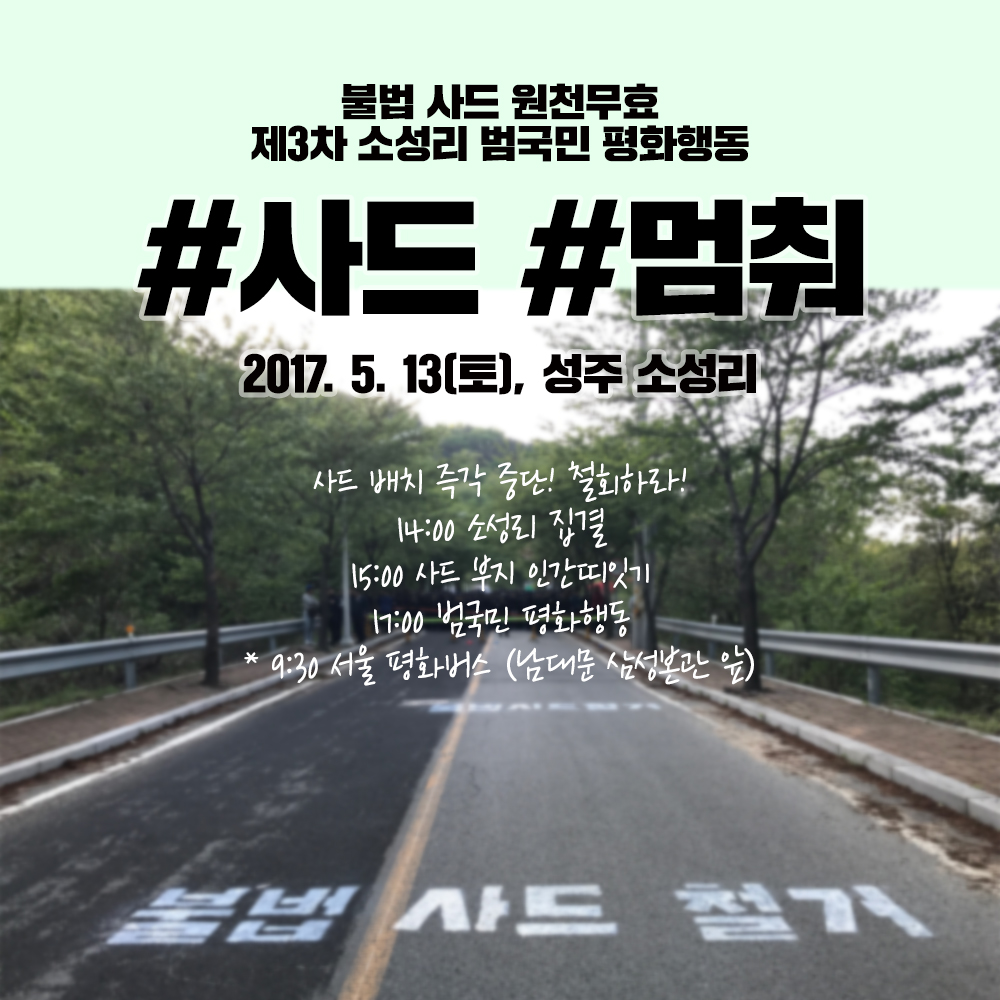 이제는 멈춰야 합니다. 새 정부가 해결해야 합니다. 다가오는 5월 13일, 소성리에 모여주세요. 사드 부지를 둘러싸고 함께 외쳐요.