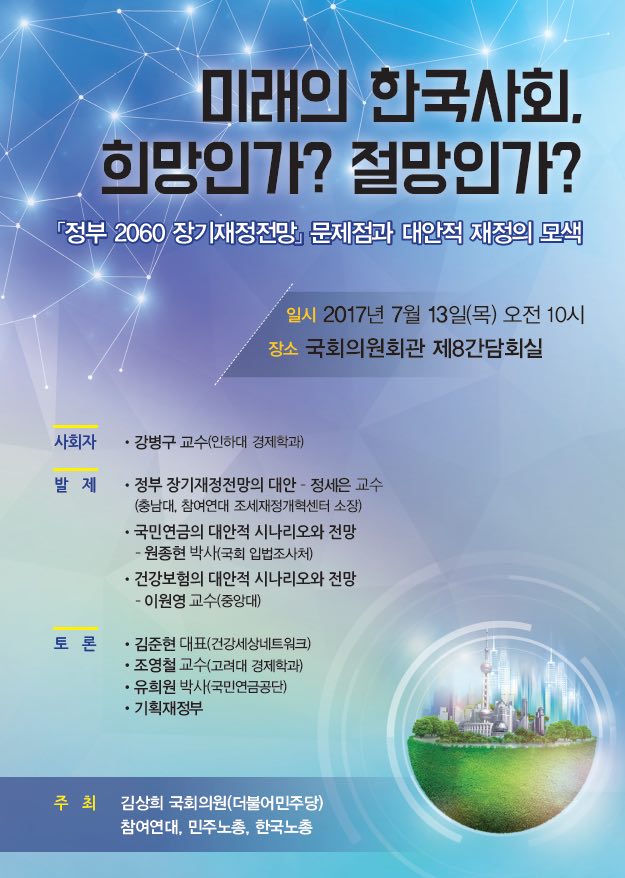 그러나 현재 한국의 GDP대비 사회복지분야 지출은 10.4%로 OECD 국가 중 최하위이며, OECD 평균(21.6%)의 절반 수준에 불과합니다. 저복지 고위험으로 세계 최저의 출산율과 급속한 고령화 현상이 나타나고 있는 한국 사회의 지속가능성을 위해서 복지의 확대는 반드시 필요하지만 정부의 장기재정전망은 이를 부정하고 있습니다. 이에 정부 장기재정전망의 문제점을 지적하고, 지속가능성을 위한 정부 재정운용방향의 대안을 제시하는 토론회를 개최하고자 하니 많은 관심 부탁드립니다.