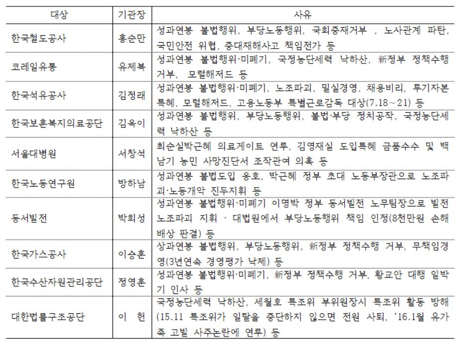 국정농단 세력에 의해 임명된 공공부문 적폐기관장들의 경영농단과 그로 인한 폐해는 오롯이 공공부문 노동자와 국민의 부담이 될 수 밖에 없다. 공대위는 적폐기관장의 경영농단으로 인한 국민 피해를 최소화하기 위하여 공공부문에서 가장 시급히 적폐를 청산해야할 10곳의 공공기관을 1차로 발표했다. 1차로 발표한 적폐기관장은 국정농단 세력 또는 황교안 대행의 알박기로 임명되었으나 아직 사퇴하지 않은 기관장, 성과연봉제 강제도입을 위해 불법행위를 자행하였으며 성과연봉제 폐기 등 새로운 정부의 정책수행을 거부하는 기관장, 국정농단 세력에 적극적으로 부역한 전력이 있는 기관장으로, 공공부문을 국민의 품으로 돌려주기 위해 지금 즉시 퇴출되어야 할 기관장들이라고 설명했다.