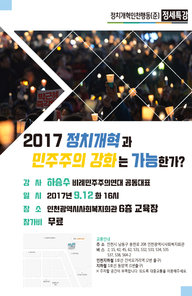 목, 2017/08/31- 21:30 에 익명 (미확인) 에 의해 제출됨 [0] 관련 개인/그룹 인천평화복지연대 지역 인천 남동구 정치개혁인천행동(준) 정세특강 2017 정치개혁과 민주주의 강화는 가능한가? ○강 사 : 하승수 비례민주주의연대 공동대표 ○일 시 : 2017년 9월 12일 16시 ○장 소 : 인천광역시사회복지회관 6층교육장 ○참가비 무료 링크 http://www.ipwn.or.kr/ipwn2015/17865 Tags 인천평화복지연대 정치개혁 민주주의 정치개혁인천행동 Like 0 Dislike 0 437 views 댓글 달기 이름 제목 Comment 저장 Preview