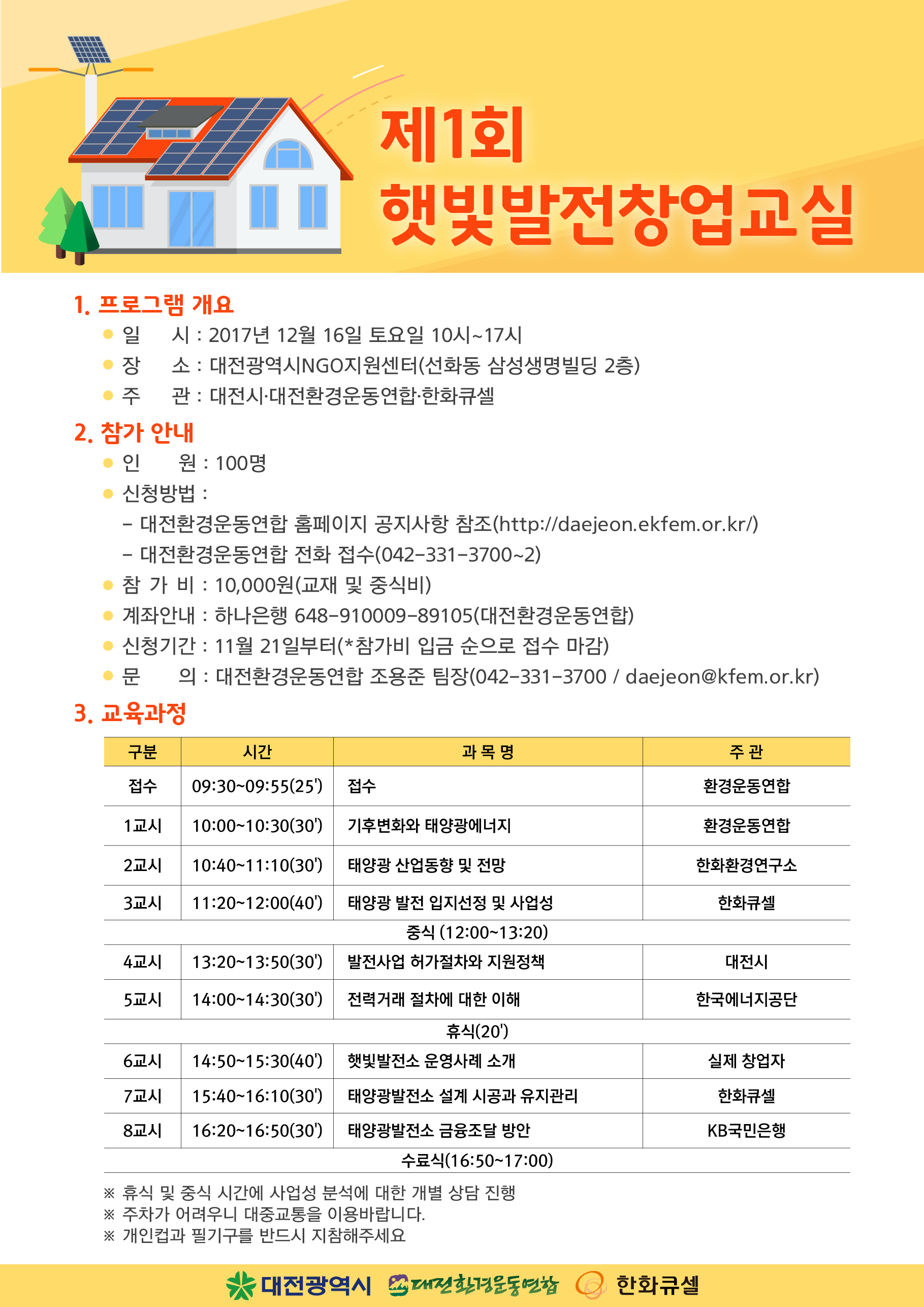 깨끗하고 풍부한 햇빛을 이용한 태양광 발전은 온실가스를 배출하지 않는 친환경 재생에너지입니다. 우리가 집과 동네에서 태양광을 세우고 스스로 전기를 공급할 수 있는 장점은 큰 매력입니다. 태양광이 어느 때보다 각광을 받고 있는 지금, 소형 ‘베란다 태양광’부터 발전사업에 이르기까지 시민들이 다양한 방식으로 태양광을 폭넓게 접하고 있습니다. 태양광 발전사업 육성과 일자리 창출을 위하여 대전시, 한화큐셀, 대전환경운동연합이 함께하는 ‘제1회 햇빛발전창업교실’에 참가자 여러분을 모십니다.
