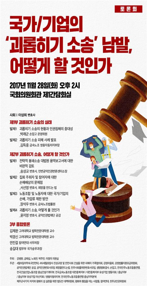 11월 28일(화) 오후2시 국회의원회관 제1간담회실에서 ‘국가/기업의 괴롭히기 소송 남발, 어떻게 할 것인가’를 주제로 토론회가 열린다. 본 토론회는 강병원, 금태섭, 노회찬, 박주민, 이정미 국회의원이 공동주최하고, 쟁의와 집회・시위에 참여한 이유로 국가와 기업으로부터 손해배상청구소송이 제기된 시민사회단체의 공동주관으로 개최된다.
