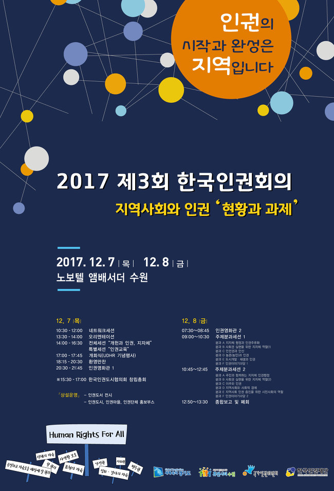 인권도시 담론과 실천의 확산을 위한 공론장, 제 3회 한국인권회의가 12월 7일(목) 13시 30분부터 수원역근처 노보텔 앰배서더 호텔에서 개최됩니다.