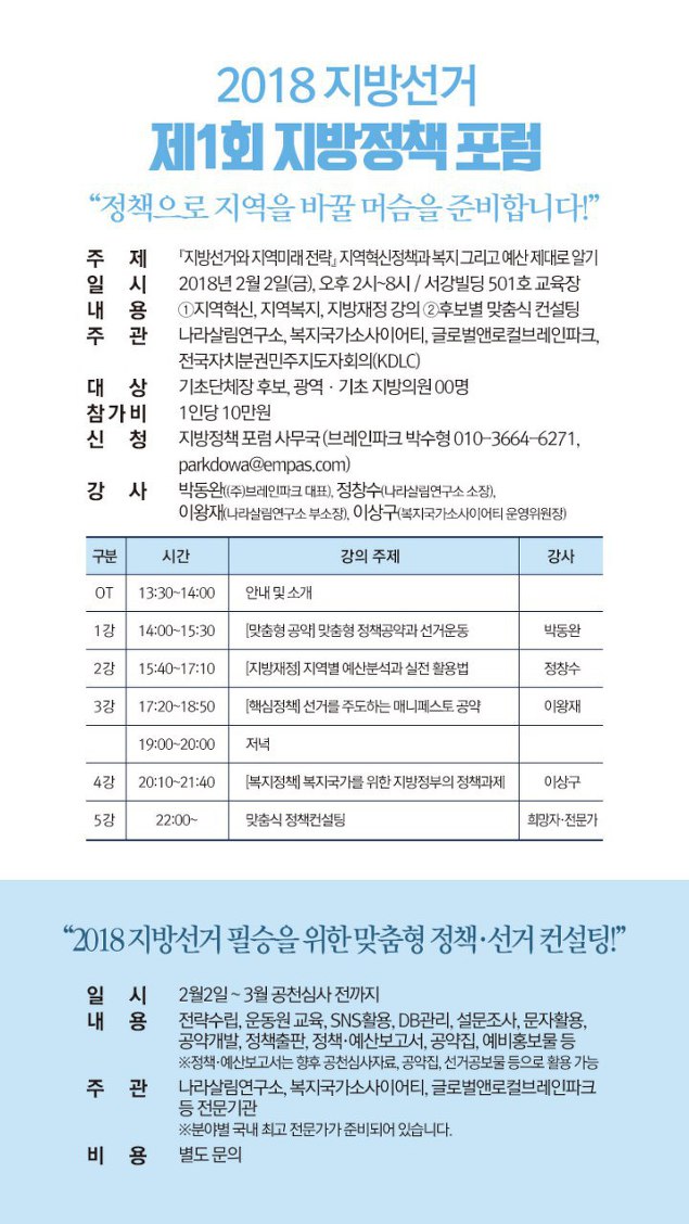 ▶ 일 시: 2월 2일 ~ 3월 공천심사 전까지 ▶ 내 용: 전략수립, 운동원교육, SNS활용, DB관리, 설문조사, 문자활용, 공약개발, 정책출판, 정책·예산보고서, 공약집, 예비홍보물 등 * 정책·예산보고서는 향후 공천심사자료, 공약집, 선거공보물 등으로 활용 가능 ▶ 주 관: 나라살림연구소, 복지국가소사이어티, 글로벌앤로컬브레인파크 등 전문기관 * 분야별 국내 최고 전문가가 준비되어 있습니다. ▶ 비 용: 별도문의