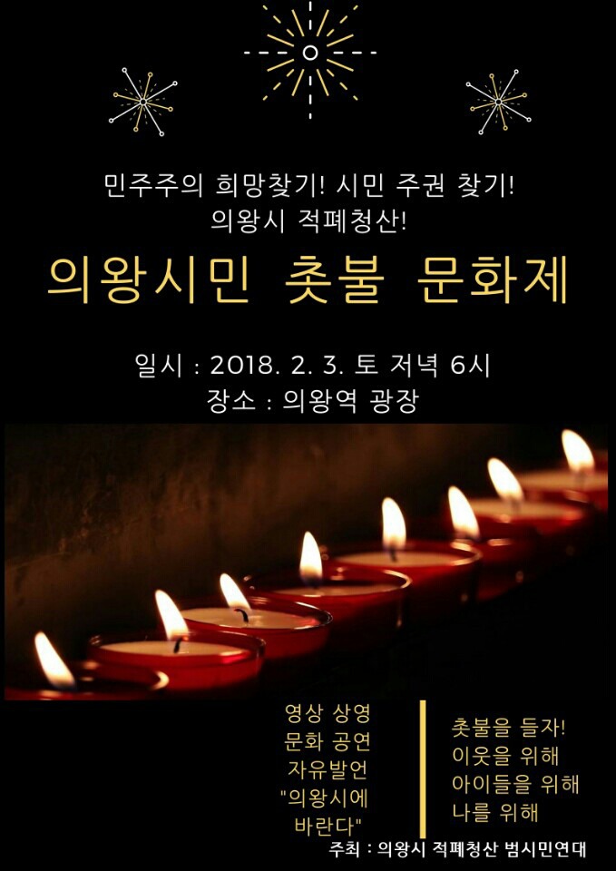 2월3일 토요일 저녁 6시~7시, 의왕역 광장에서 "민주주의 희망찾기, 시민주권찾기, 의왕시 적폐청산 의왕시민 촛불 문화제"가 열립니다.