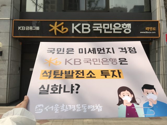 ⓒ그린피스 greenpeace.org/korea/news/feature-story/3/2015/how-to-check-pm25[/caption] 언론보도에 따르면 KB국민은행이 안인석탄화력 사업의 금융조달을 위해 조만간 4.5조원에 달하는 사상 최대의 투자 유치를 한다고 알려졌습니다. KB국민은행의 석탄발전 투자유치는 이번이 처음이 아닙니다. 이미 고성 하이석탄발전소 건설 사업에 대한 금융주선을 마쳤습니다. 석탄발전소 사업에 투자유치를 하는 유력한 은행임에도 지난해 ‘기후변화 대응 우수 기업’으로 선정되었습니다. 이렇게 국민의 ‘숨 쉴 권리’를 위협하는 석탄화력발전소에 금융주선하는 KB국민은행을 규탄하기 위해 서울환경운동연합이 나섰습니다. 석탄화력발전소 건설 백지화 강릉범시민대책위원회와 환경운동연합이 4월 10일 강릉에서 진행한 기자회견을 시작으로, 미세먼지 유발 사업에 앞장서는 국민은행의 전국 주요 지점에서 캠페인을 펼치고 있습니다. 4월 19일은 서울환경운동연합이 광화문 앞 KB국민은행에서 1인시위를 진행했습니다. [caption id="attachment_190308" align="aligncenter" width="640"]