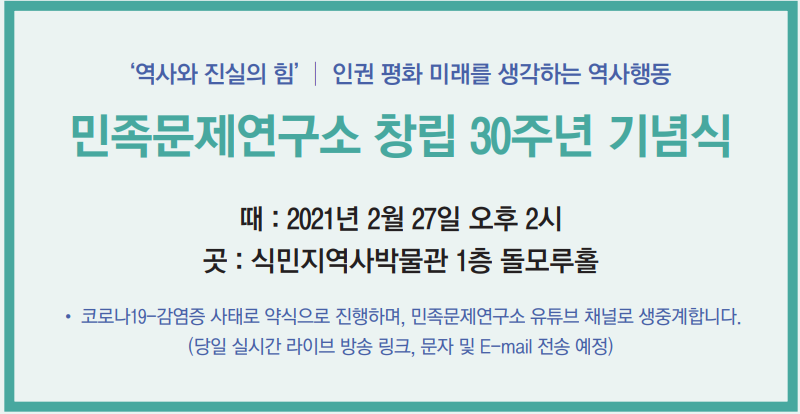 친일문제 연구의 선구자 임종국 선생의 유지와 반민특위의 정신을 이어받은 민족문제연구소가 2월 27일(일제침략이 시작된 강화도조약 체결일)로 창립 30주년을 맞는다. 그간 연구소는 숱한 고난과 역경을 뚫고 역동하는 조직으로 성장했다. 짧지 않은 세월인 만큼 괄목할만한 성과도 거두었지만 역량이 따라주지 않아 미처 주목하지 못한 아쉬운 부분도 적지 않았다.