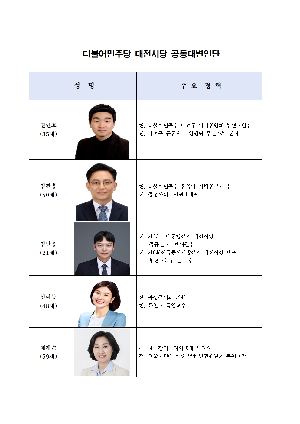 시민 소통을 위한 가교 역할을 담당할 대변인으로는 △권인호 (35세, 더불어민주당 대덕구 지역위원회 청년위원장) △김관홍(50세,더불어민주당 중앙당 정책위 부위원장) △ 김난웅(21세, 제20대 대통령선거 대전시당 공동선거대책위원장) △인미동(48세, 유성구의원) △채계순 (59세, 전 대전시의원)이 임명됐다.