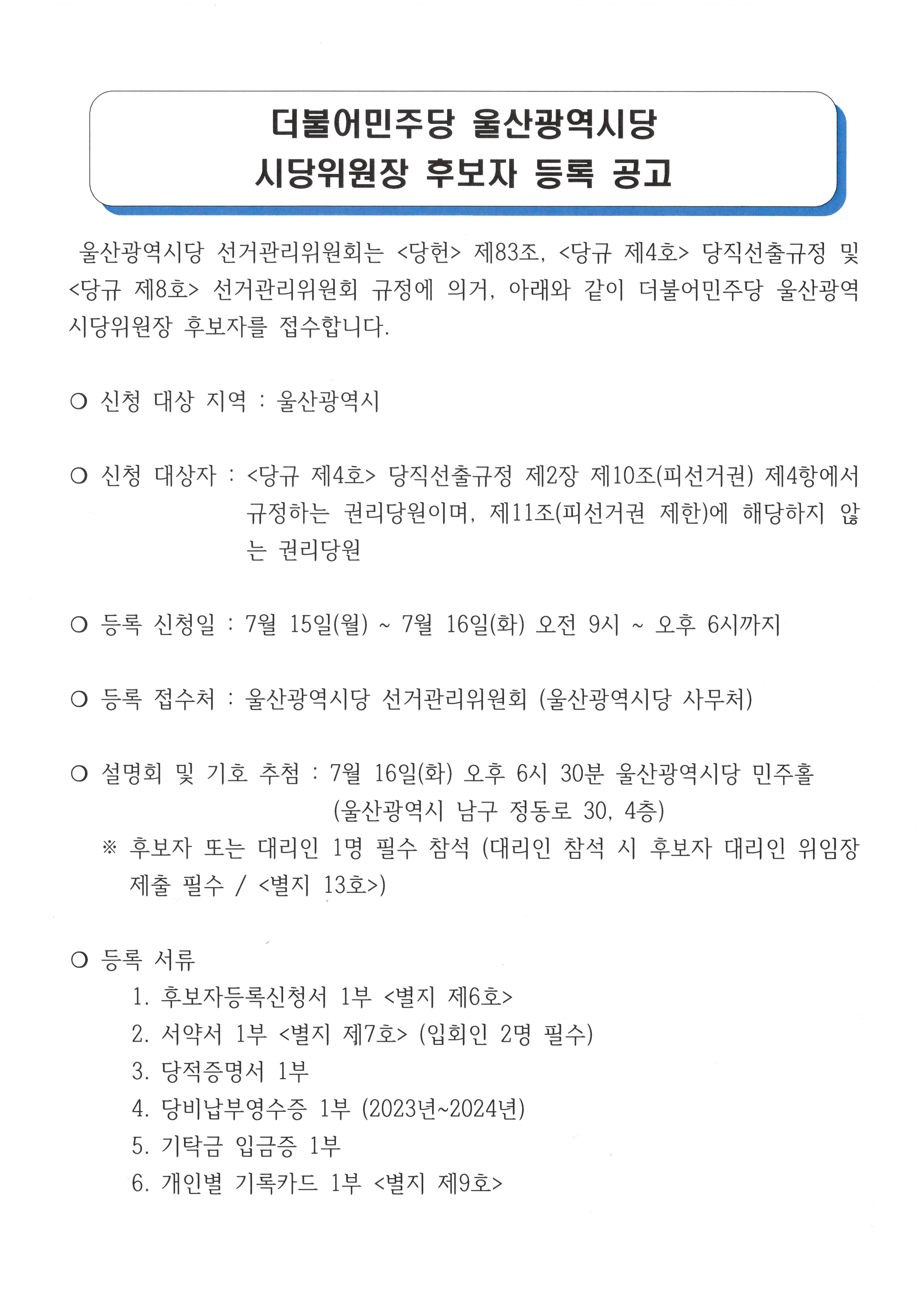 목, 2024/07/11- 00:00 에 admin 에 의해 제출됨 [0] 관련 개인/그룹 민주당 울산시당 정당 더불어민주당 지역 울산 카테고리 공지사항 더불어민주당_울산광역시당_시당위원장_후보자_등록_공고.hwp 링크 https://ulsan.theminjoo.kr/party/sub/news/view.php?brd=114&post=1968&board_id=notice Like 0 Dislike 0 1 view 댓글 달기 이름 제목 Comment 저장 Preview