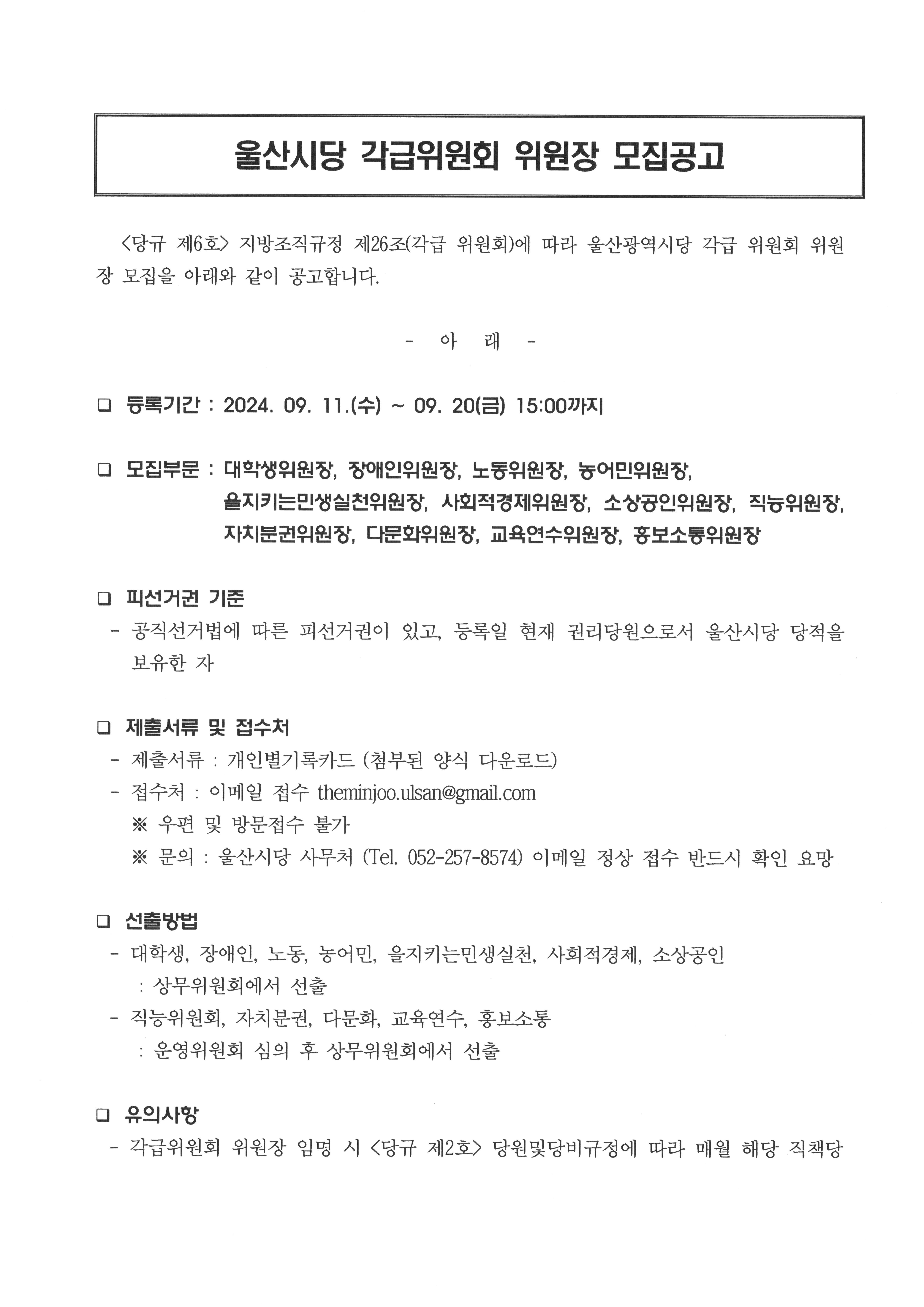 수, 2024/09/11- 00:00 에 admin 에 의해 제출됨 [0] 관련 개인/그룹 민주당 울산시당 정당 더불어민주당 지역 울산 카테고리 공지사항 별지_제9호_개인별_기록카드.hwp 링크 https://ulsan.theminjoo.kr/party/sub/news/view.php?brd=114&post=1982&board_id=notice Like 0 Dislike 0 댓글 달기 이름 제목 Comment 저장 Preview
