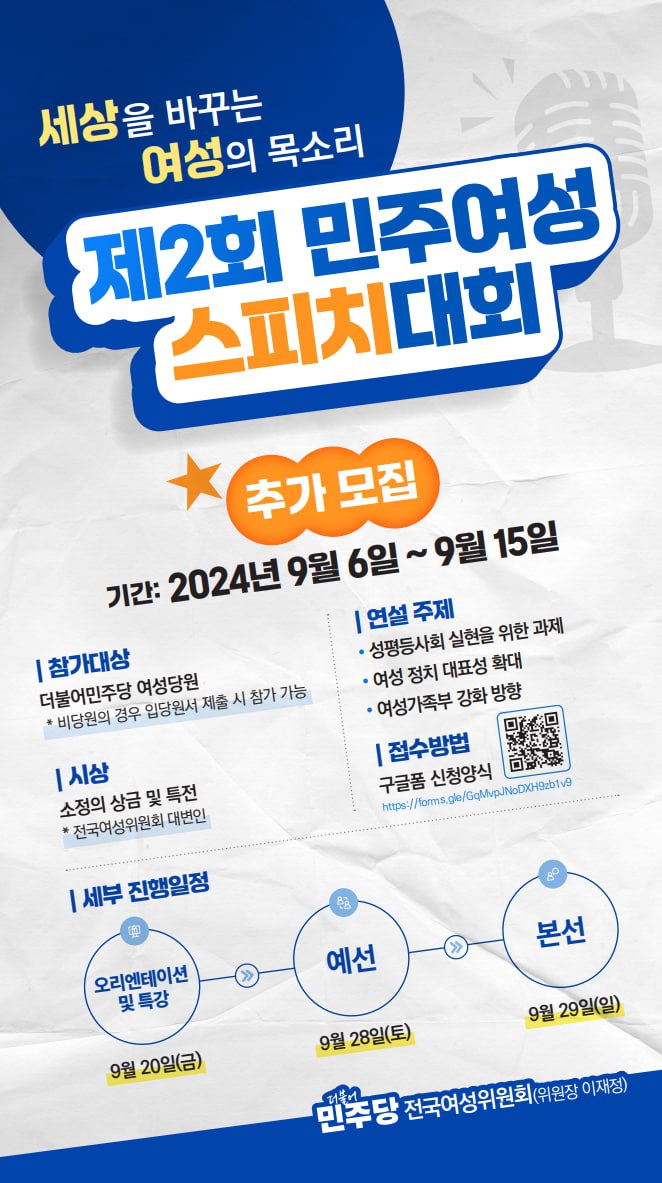 [제2회 민주여성스피치대회] 추가 모집❏ 모집기간 : 9월 6일(금) ~ 9월 15일(일)❏ 접수방법 : 구글폼 (https://vvd.bz/ftqQ)※ 오리엔테이션 및 특강 : 9월 20일(금)※ 예선 : 9월 28일(토)※ 본선 : 9월 29일(일)* 자세한 내용은 웹자보를 참고해주시기 바랍니다.Google Docs (https://vvd.bz/ftqQ)제2회 민주여성스피치대회 신청양식세상을 바꾸는 여성의 목소리