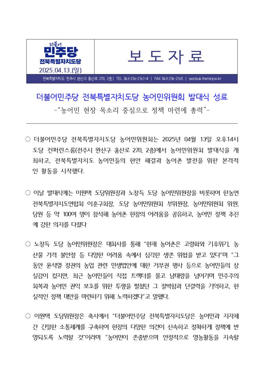 일, 2025/04/13- 00:00 에 admin 에 의해 제출됨 [0] 관련 개인/그룹 민주당 전북도당 정당 더불어민주당 지역 전북 카테고리 보도자료 250413_보도자료_전북특별자치도당_ 농어민위원회_발대식_v1.0.hwp농어민위원회발대식2.jpg 링크 https://jeonbuk.theminjoo.kr/party/sub/news/view.php?brd=249&post=1644&board_id=press Like 0 Dislike 0 댓글 달기 이름 제목 Comment 저장 Preview