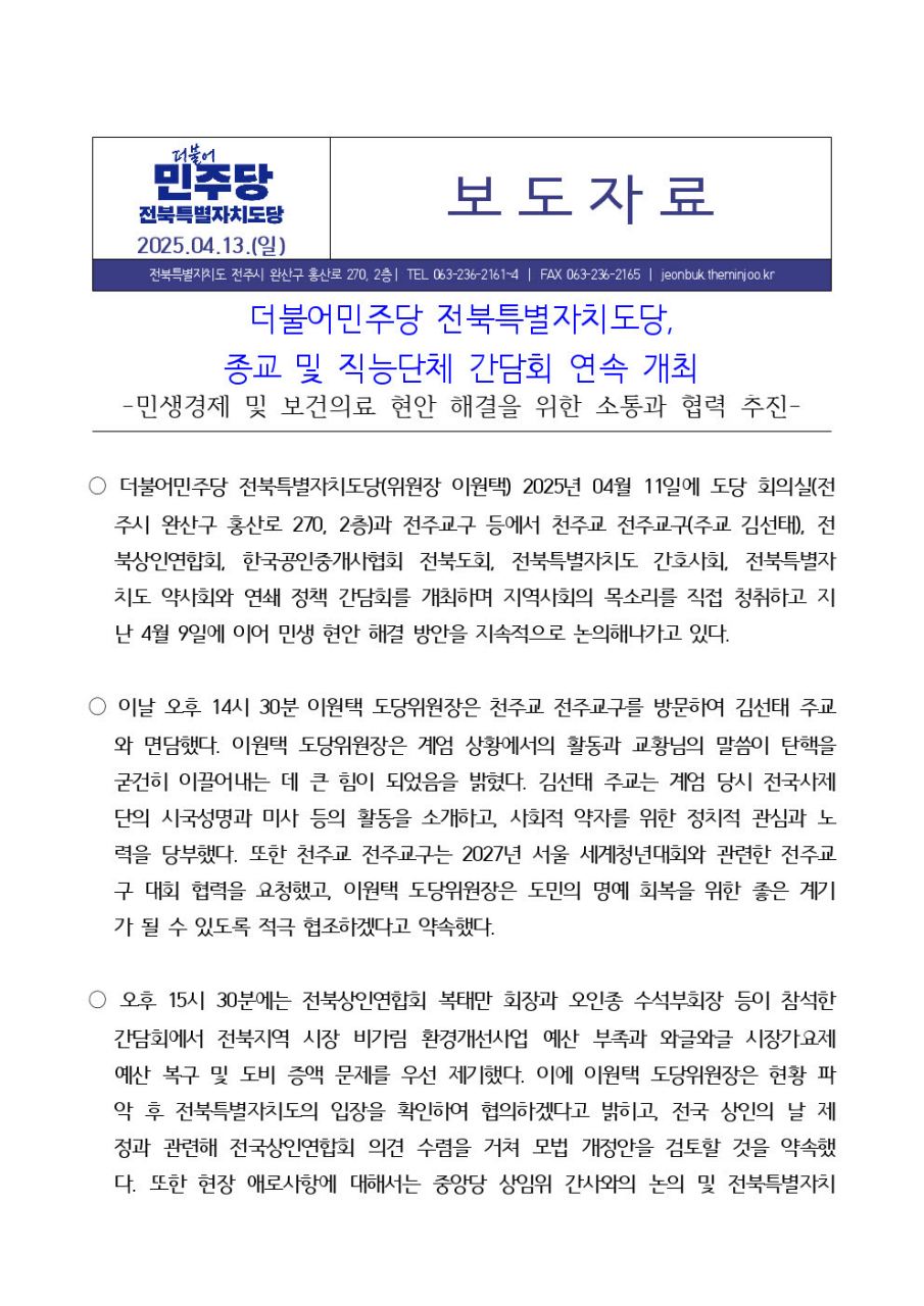 일, 2025/04/13- 00:00 에 admin 에 의해 제출됨 [0] 관련 개인/그룹 민주당 전북도당 정당 더불어민주당 지역 전북 카테고리 보도자료 250413_보도자료_전북지역_종교_직능_간담회_v1.0.hwp전주교구간담회사진4.jpg소상공인간담회사진5.jpg공인중개사협회간담회사진7.jpg전북특별자치도 간호사회 간담회사진5.jpg약사회간담회사진1.jpg 링크 https://jeonbuk.theminjoo.kr/party/sub/news/view.php?brd=249&post=1641&board_id=press Like 0 Dislike 0 댓글 달기 이름 제목 Comment 저장 Preview