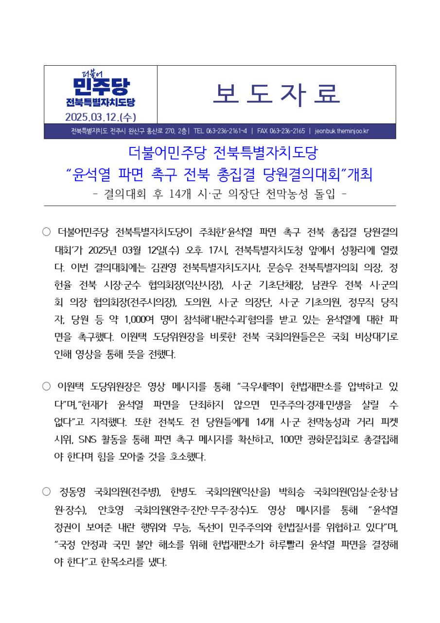 수, 2025/03/12- 00:00 에 admin 에 의해 제출됨 [0] 관련 개인/그룹 민주당 전북도당 정당 더불어민주당 지역 전북 카테고리 보도자료 250312_(보도자료) 윤석열_파면_촉구_전북_총집결_결의대회 (최종)_v2.0.hwp결의대회2.jpg결의대회1.jpg결의대회3.jpg 링크 https://jeonbuk.theminjoo.kr/party/sub/news/view.php?brd=249&post=1601&board_id=press Like 0 Dislike 0 댓글 달기 이름 제목 Comment 저장 Preview