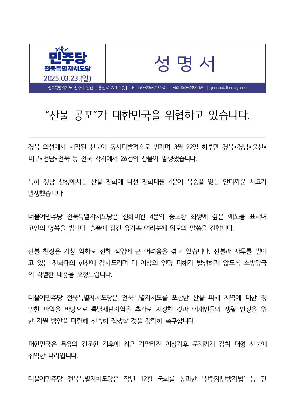 월, 2025/03/24- 00:00 에 admin 에 의해 제출됨 [0] 관련 개인/그룹 민주당 전북도당 정당 더불어민주당 지역 전북 카테고리 보도자료·성명·논평 전자점자 내려받기 점자뷰어 보기250323_성명서_산불_관련_피해_애도.hwp 링크 https://jeonbuk.theminjoo.kr/party/sub/news/view.php?brd=60&post=1608&board_id=briefing Like 0 Dislike 0 댓글 달기 이름 제목 Comment 저장 Preview