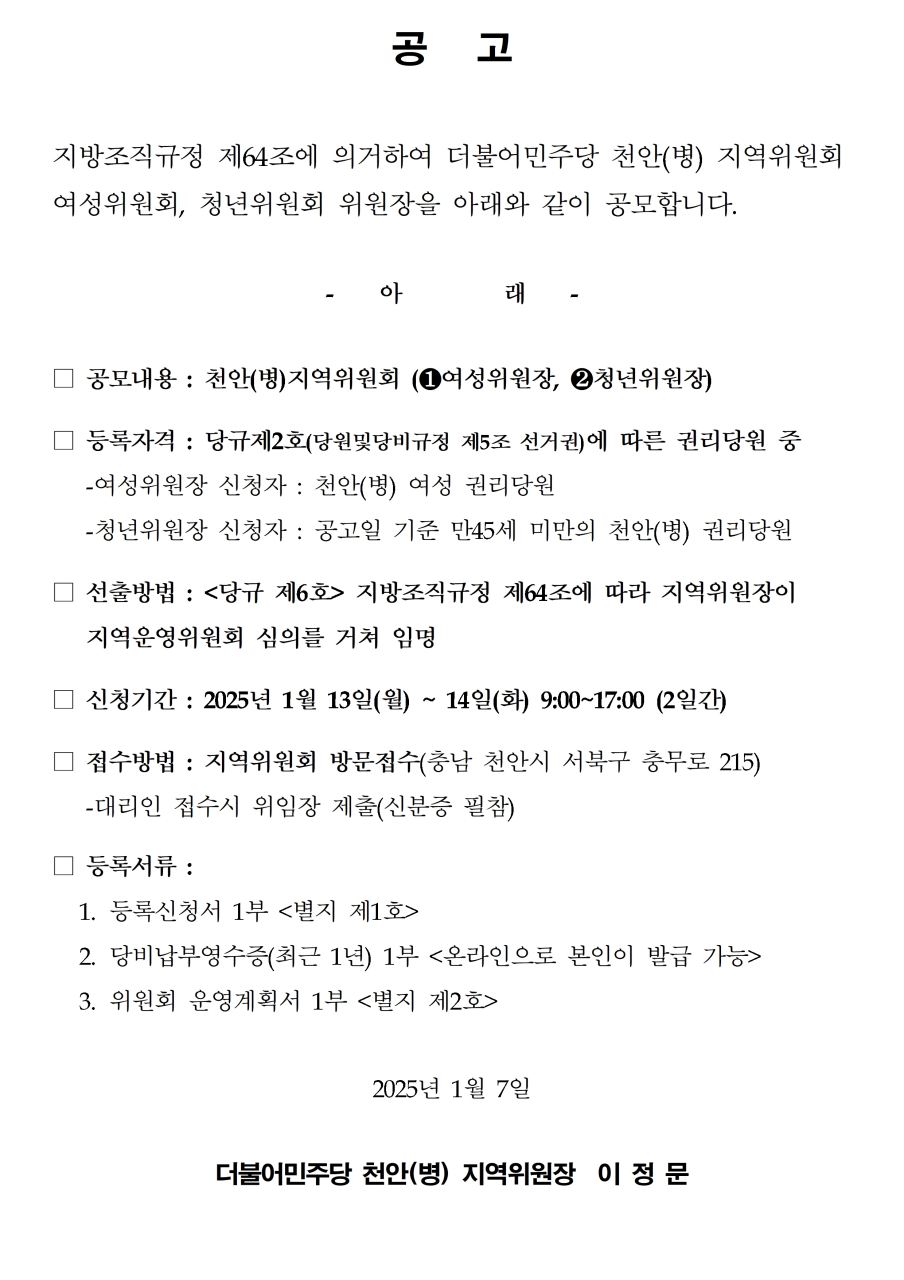 월, 2025/01/06- 00:00 에 admin 에 의해 제출됨 [0] 관련 개인/그룹 민주당 충남도당 정당 더불어민주당 지역 충남 카테고리 공지사항 신청서류_관련_양식_v1.hwp 링크 https://chungnam.theminjoo.kr/party/sub/news/view.php?brd=108&post=911&board_id=notice Like 0 Dislike 0 1 view 댓글 달기 이름 제목 Comment 저장 Preview