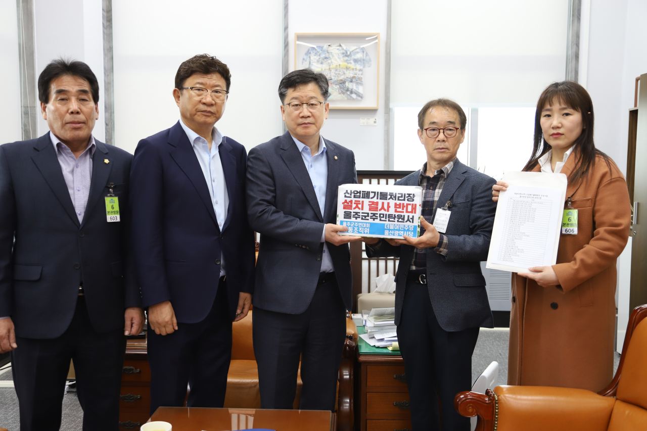 더불어민주당 울산시당(위원장 이선호)은 14일(월) 오후, 울주군 온산읍 삼평리 산업폐기물처리장 설립 반대를 주장하는 울주군 주민대표와 함께 국회를 방문해 안호영 국회 환경노동위원장(이하 환노위)과 면담했다.