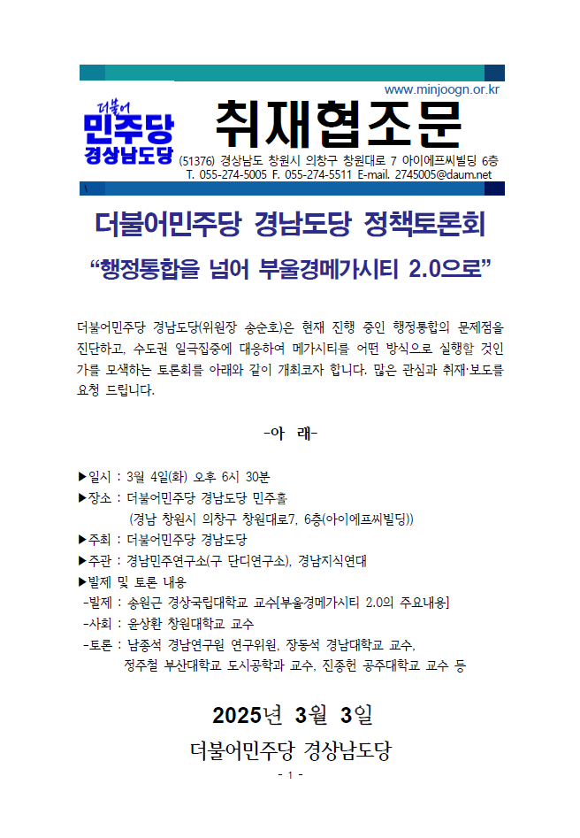 더민주 경남도당 - 취재협조문 - 경남도당 정책토론회 개최
