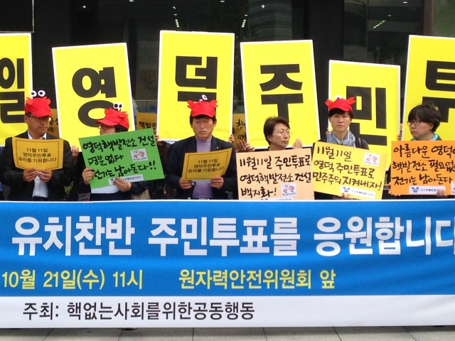 이날 모인 환경운동연합 등 핵없는사회를위한공동행동 소속단체들은 발언을 통해 “주민들의 의사를 확인하는 절차로서 주민투표는 지극히 당연한 것”이라며, “영덕군민들이 꼭 11월 11~12일 실시되는 영덕핵발전소 유치찬반 주민투표에 참여해서 주민승리의 결과를 내기를 진심으로 응원한다”고 주민투표 지지의사를 밝혔다.