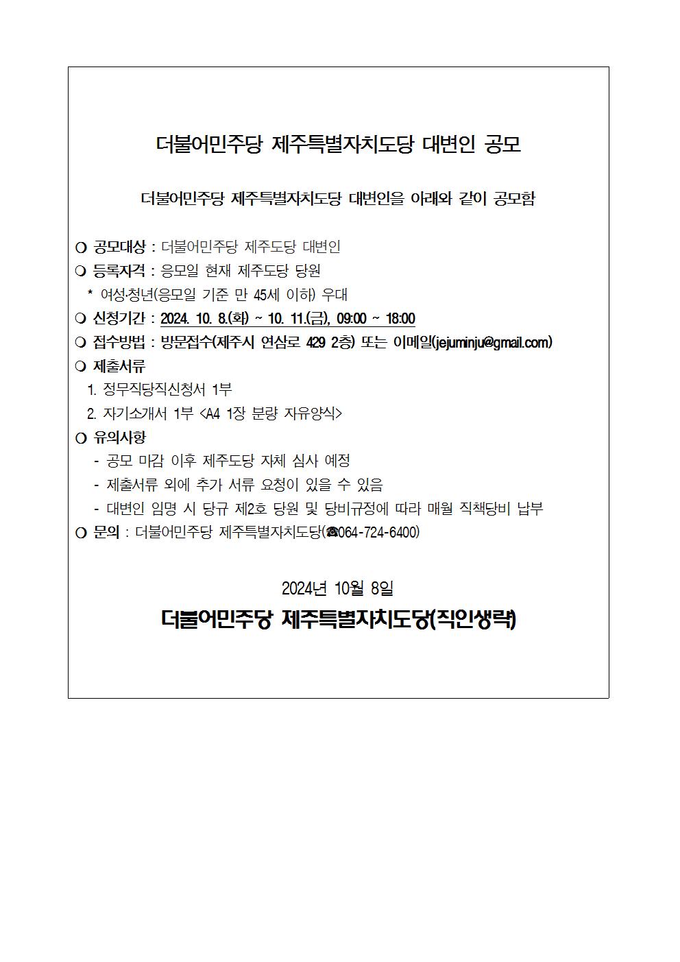 화, 2024/10/08- 00:00 에 admin 에 의해 제출됨 [0] 관련 개인/그룹 민주당 제주도당 정당 더불어민주당 지역 제주 카테고리 공지사항 링크 https://goodjeju.org/m/bbs/board.php?bo_table=1_1_1_1&wr_id=580 Like 0 Dislike 0 댓글 달기 이름 제목 Comment 저장 Preview