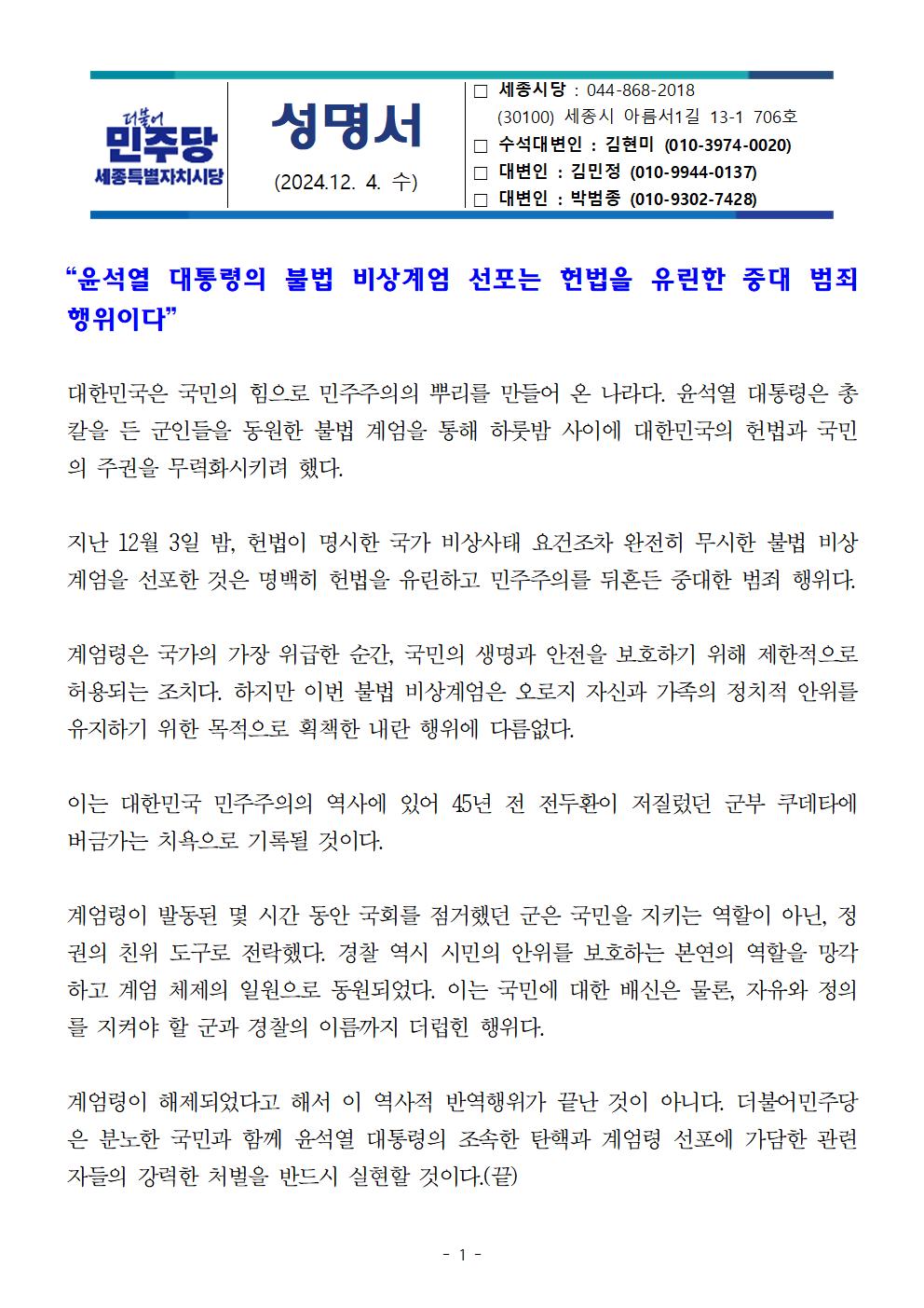 금, 2024/12/06- 00:00 에 admin 에 의해 제출됨 [0] 관련 개인/그룹 민주당 세종시당 정당 더불어민주당 지역 세종 카테고리 보도자료 20241204_(성명서)윤석열 대통령의 불법 비상계엄 선포는 헌법을 유린한 중대 범죄 행위이다.pdf 링크 https://sejong.theminjoo.kr/party/sub/news/view.php?brd=244&post=879&board_id=press Like 0 Dislike 0 댓글 달기 이름 제목 Comment 저장 Preview