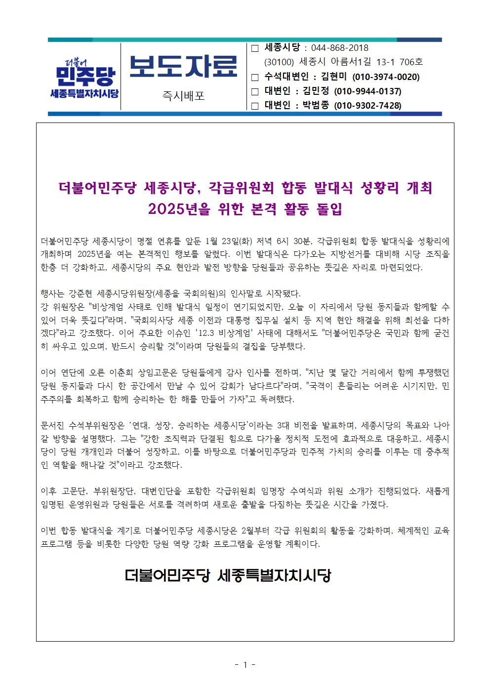 월, 2025/02/03- 00:00 에 admin 에 의해 제출됨 [0] 관련 개인/그룹 민주당 세종시당 정당 더불어민주당 지역 세종 카테고리 보도자료 20250203_보도자료 더불어민주당 합동 발대식 성황리 개최.pdf 링크 https://sejong.theminjoo.kr/party/sub/news/view.php?brd=244&post=891&board_id=press Like 0 Dislike 0 댓글 달기 이름 제목 Comment 저장 Preview