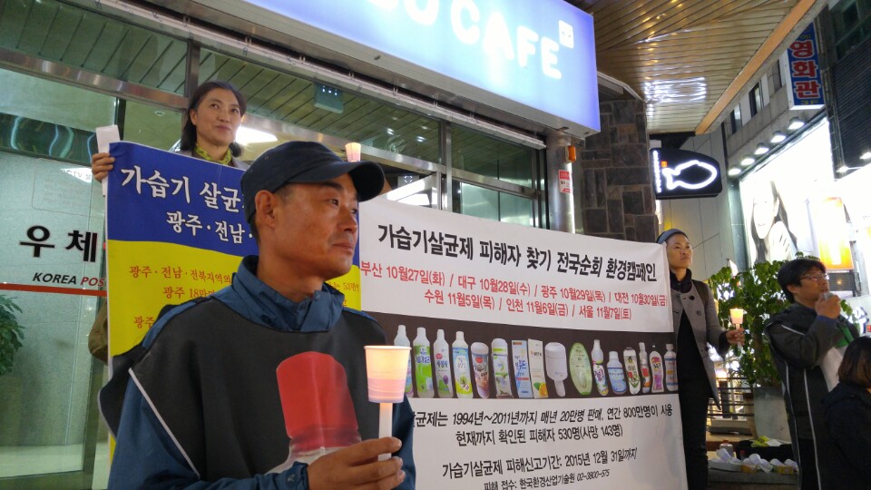 2015년 10월 29일(목) 2시 롯데마트 상무점 앞, 7시 충장로 광주우체국 앞에서 가습기 살균제 피해자 찾기 캠페인과 피해자 지역모임이 진행되었습니다.