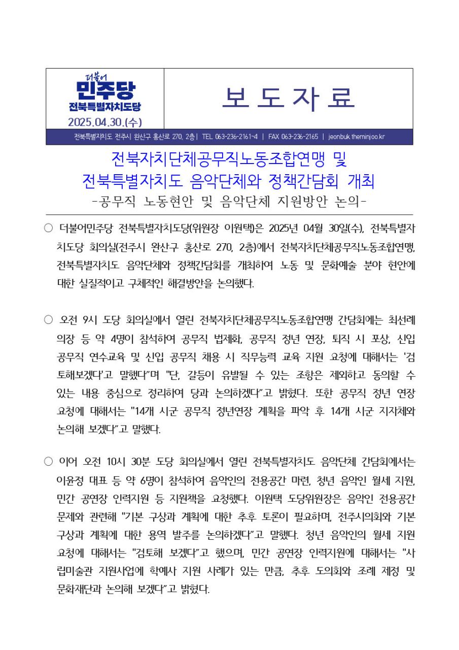 250430_보도자료_전북자치단체공무직노동조합연맹_및_ 전북특별자치도음악단체_간담회_v1.0.hwp전북자치단체공무직노동조합연맹2.jpg전북자치단체공무직노동조합연맹3.jpg전북특별자치도 음악단체 간담회2.jpg전북특별자치도 음악단체 간담회5.jpg