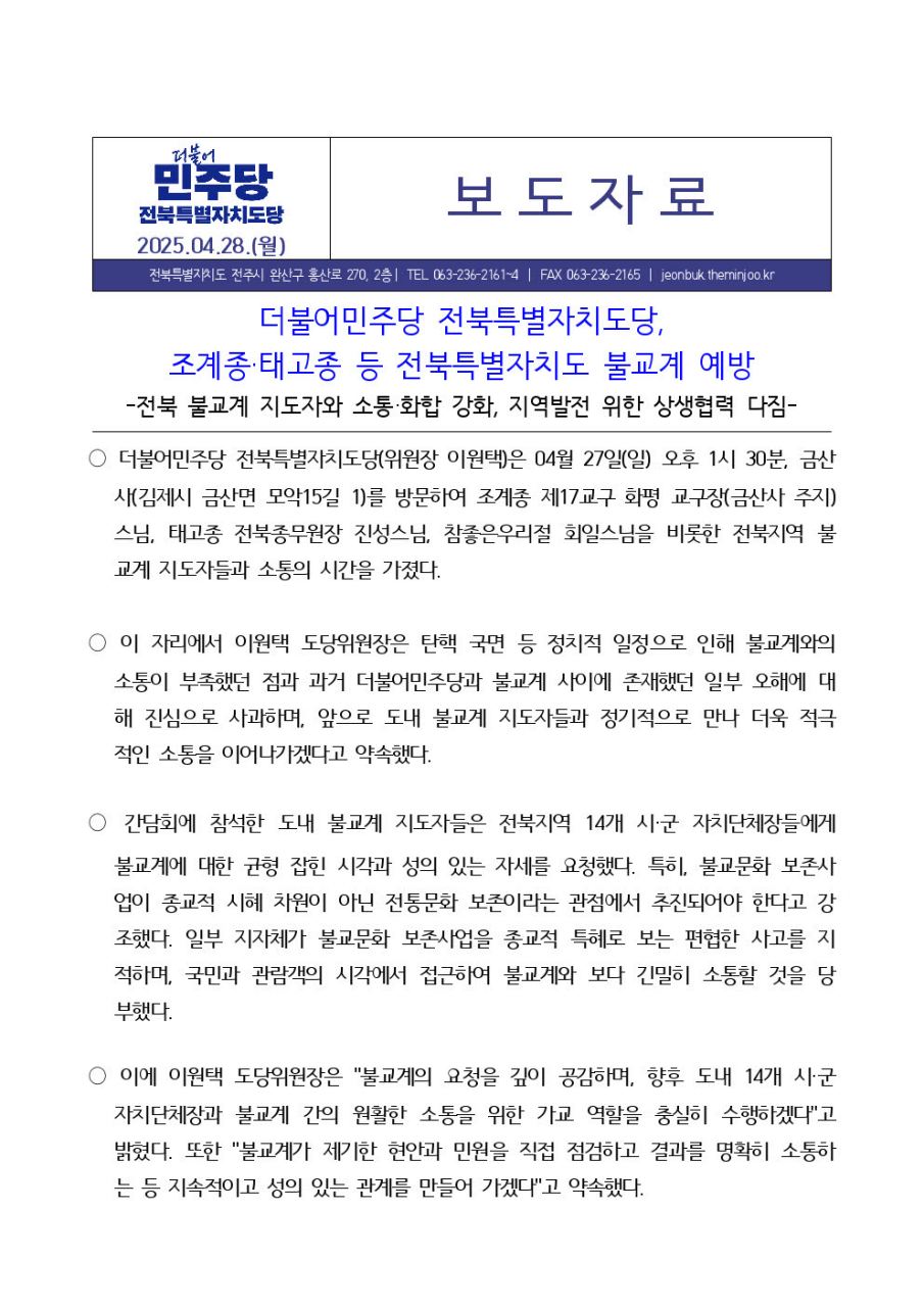 월, 2025/04/28- 00:00 에 admin 에 의해 제출됨 [0] 관련 개인/그룹 민주당 전북도당 정당 더불어민주당 지역 전북 카테고리 보도자료 250428_보도자료_조계종_태고종_ 전북특별자치도_불교계_예방_v1.0.hwp전북불교종단예방1.jpg전북불교종단예방4.jpg 링크 https://jeonbuk.theminjoo.kr/party/sub/news/view.php?brd=249&post=1681&board_id=press Like 0 Dislike 0 댓글 달기 이름 제목 Comment 저장 Preview