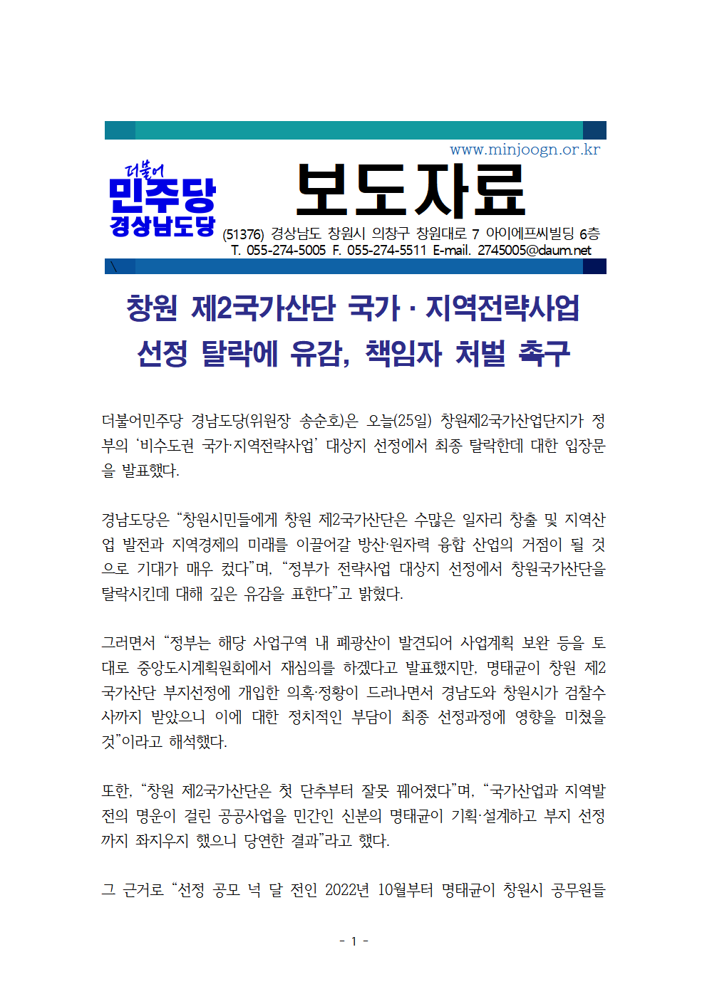 민주당 경남도당 - 창원 제2국가산단 탈락 책임자 처벌 촉구