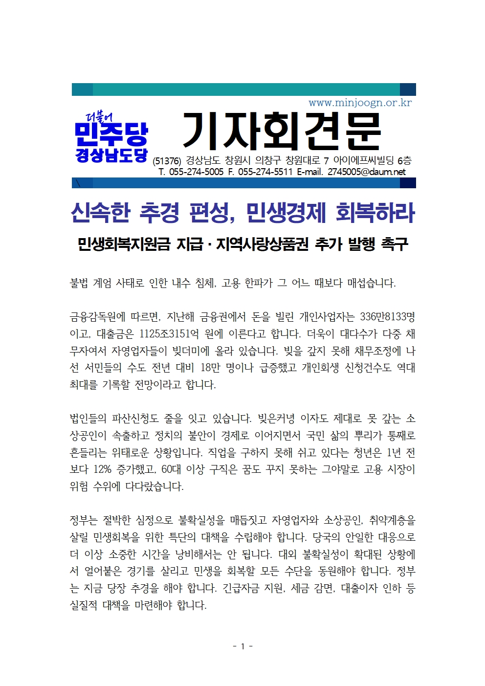 민주당 경남도당 - 기자회견문 - 신속한 추경 편성, 민생경제 회복하라!